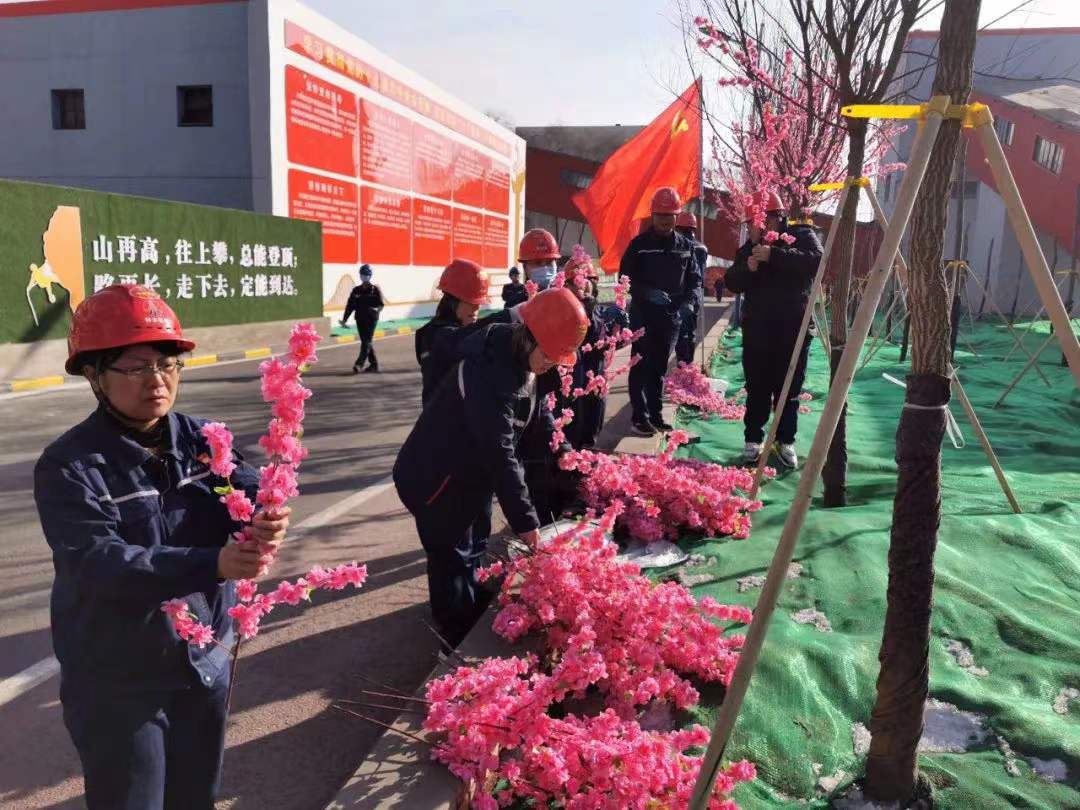 “電石黨支部認(rèn)領(lǐng)第5區(qū)域內(nèi)的桃花枝綁掛任務(wù)。”特別值得一提的是,所有綁掛任務(wù)都是由各黨支部主動(dòng)認(rèn)領(lǐng)的,結(jié)合當(dāng)月的主題黨日活動(dòng)開展,全體黨員爭當(dāng)主人翁,自己動(dòng)手扮靚廠區(qū)。高個(gè)子男同志負(fù)責(zé)爬上梯子,用扎絲將花枝牢牢捆綁在樹枝上,女同志們則發(fā)揮愛美的特長,將仿真花枝折出千姿百態(tài),一朵朵嬌艷的桃花,一張張盛開的笑臉,大家分工協(xié)作,干得熱火朝天。