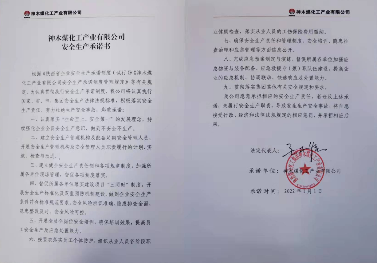 神木煤化工產業有限公司2022年安全生產承諾書公示
