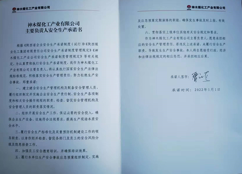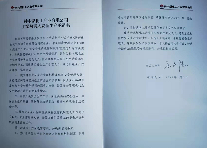 神木煤化工產業有限公司主要負責人2022年安全生產承諾書公示