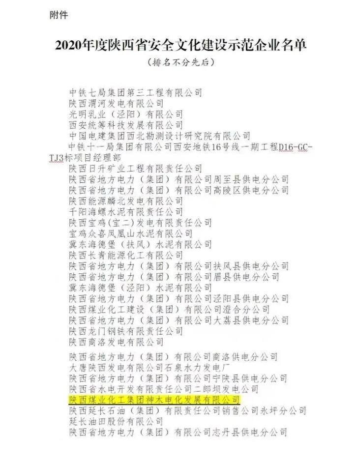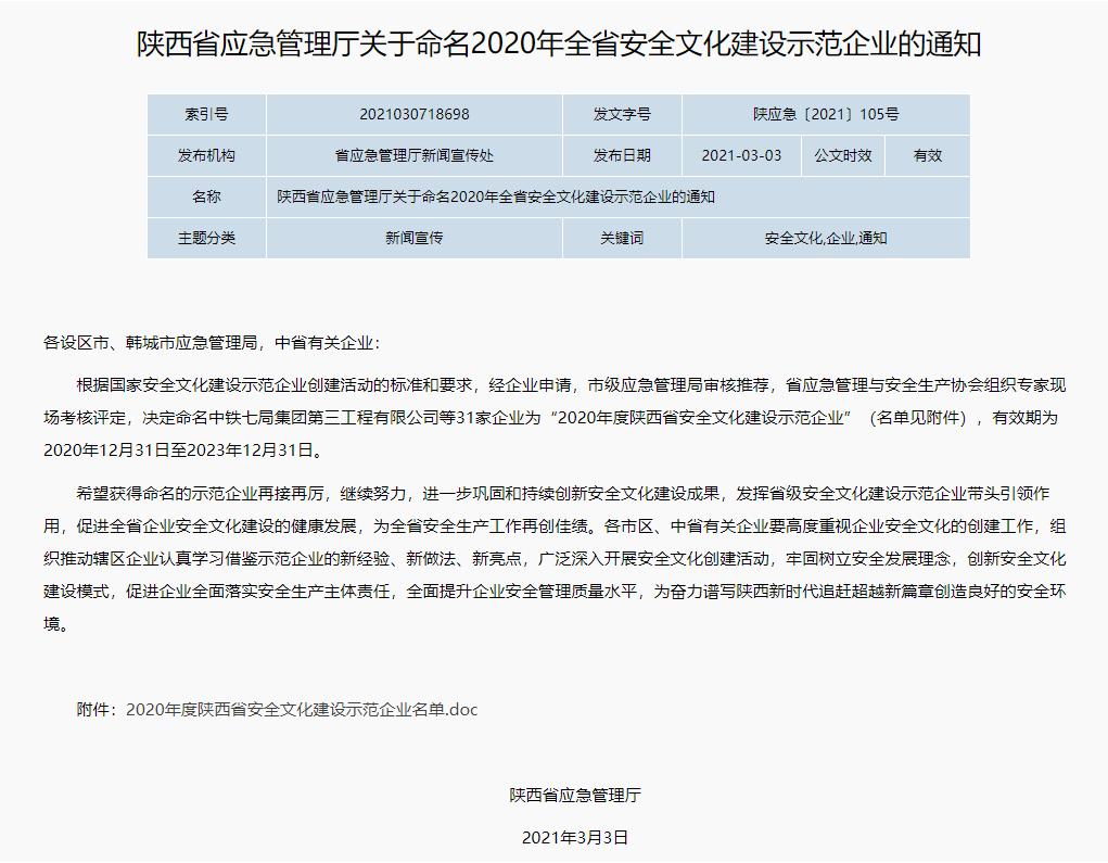 近日,從陜西省應急管理廳發布的《關于命名2020年全省安全文化建設示范企業的通知》陜應急〔2021〕105號文件中獲悉,電化公司順利通過省應急管理廳與安全生產協會專家現場考評,被評定為“2020年度陜西省安全文化建設示范企業”,有效期為2020年12月31日至2023年12月31日。