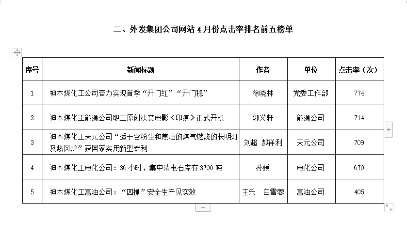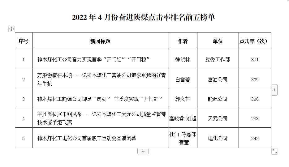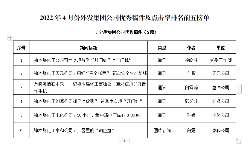 關于2022年4月份神木煤化工公司發稿及優秀稿件評選情況的通報